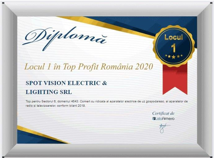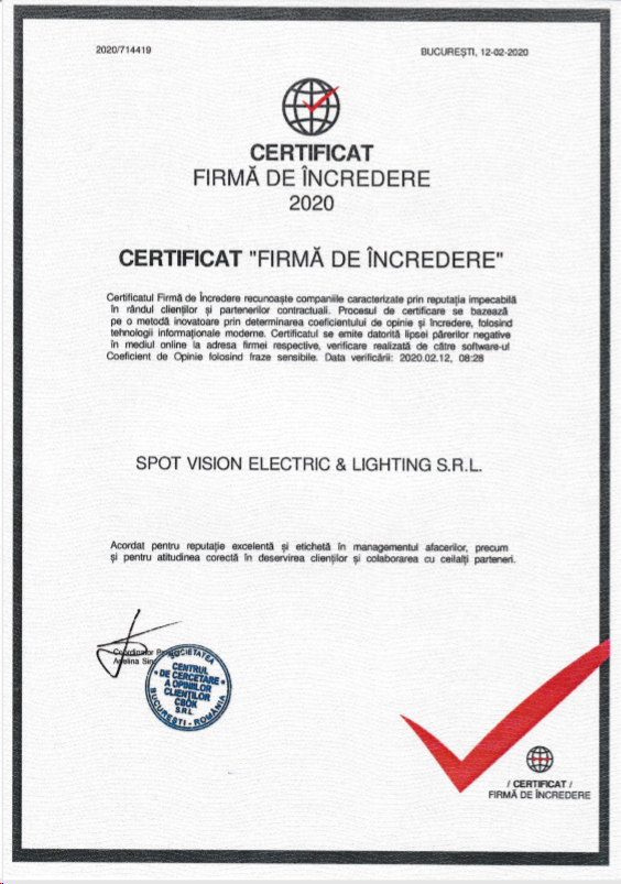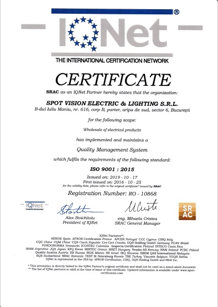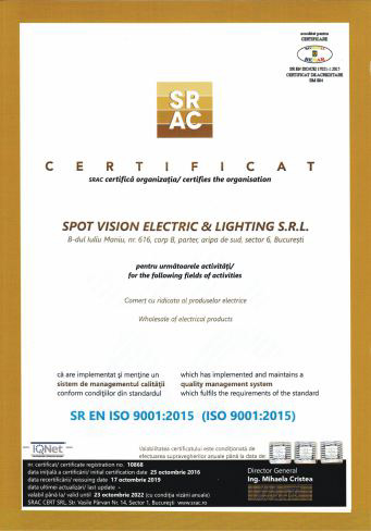 S.C. Spot Vision Electric & Lighting SRL detine Certificate implementate pentru Sistemul de calitate al Managementului ISO 9001:2008 si de comert cu ridicata al produselor electrice SR EN ISO 9001:2008.